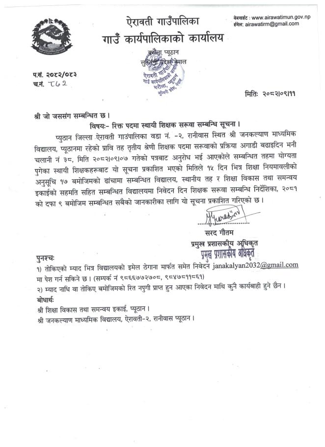 रिक्त पदमा स्थायी शिक्षक सरुवा सम्बन्धी जानकारी सम्बन्धीत सबैको जानकारीको लागि ।