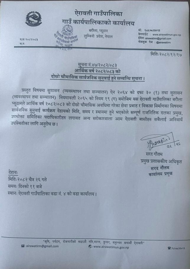 आ.व.२०८२/८३ कोे दोस्रो चौमासिक अवधिको सार्वजनिक सुनुवाई कार्यक्रम सम्बन्धी सूचना।