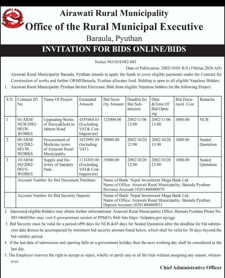 Invitation for Bids for Baireni Gothibang Road Upgrading Works in Majuwa and Dhabang Section.