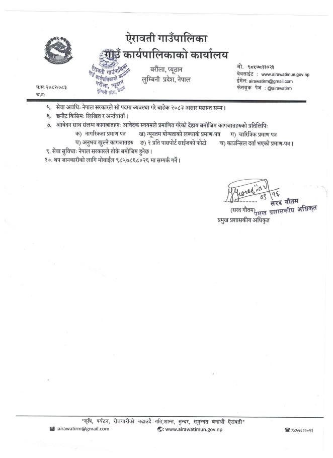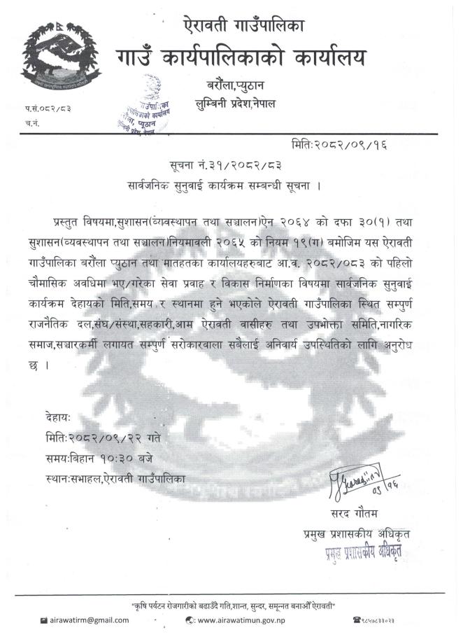 २०८२/०९/२२ गते मंगलबारको दिन यस ऐरावती गाउँपालिकाको आ.व.२०८२/८३ को प्रथम चौमासिक अवधिको सार्वजनिक सुनुवाई कार्यक्रम ऐरावती गाउँपालिकाको सभाहलमा बिहान १०.३० बजे देखी हुने कार्यक्रम रहेको छ।
